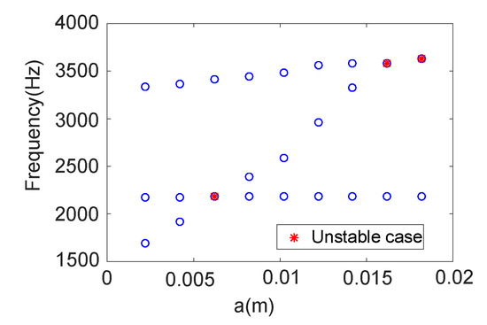Figure 16 shows the influence of a larger friction coefficient (μ = 0.43) on the occurrence of instabilities. Effective contact zones for 3500 Hz still have larger size than those for 2100 Hz. The majority of contact localizations for unstable modes are almost similar (Figure 16a,c). The increase of friction coefficient makes the system unstable at more contact zones near the trailing edge (Figure 16c) and change the dimensions of contact localizations for coupling 2. This means that both friction coefficient and contact localization play a crucial role on mode-coupling instabilities.