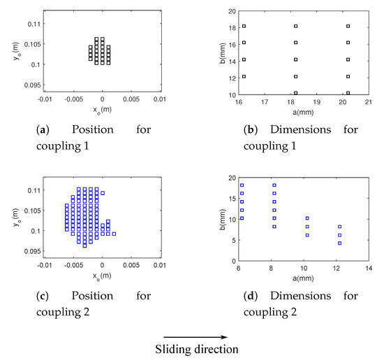 The assumption of uniform contact can underestimate unstable frequencies [35]. Considering that the effective contact zone always changes during braking because of thermal effects, dilatation, wear, tribology, etc., the influence of contact distribution on squeal frequency needs to be analyzed. For this purpose, 2 scales are considered in the following: macroscopic and mesoscopic i.e., at the scale of global contact area and at the scale of the tribological layer made of powders and plateaus. It is assumed that effective contact zone is in full sliding state and its localization (position, dimensions) can be varied.