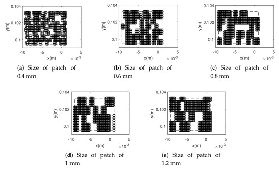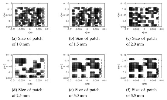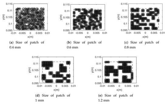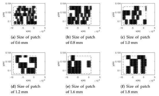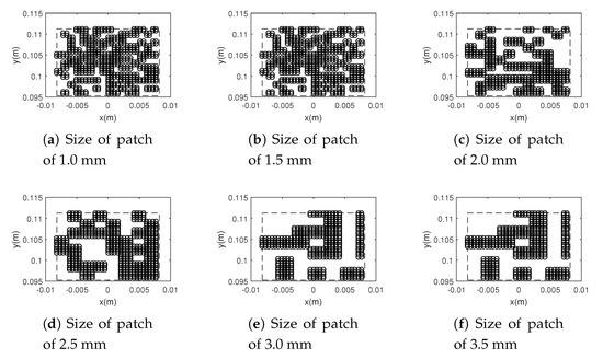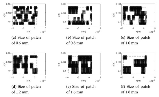 At macroscopic scale, effective contact zones prone to instability have been found. However, assumption of a smooth surface is not realistic because plateaus are always formed as a result of tribological circuit. From the results in the above section, two macroscopic contact zones corresponding to the two different unstable frequencies are assumed (Figure 17). In order to study the influence of plateaus distribution on mode-coupling instability at 2100 Hz, as in [14], the macroscopic unstable contact zone is divided in a certain number of uniform patches (Figure 17a). Each patch is independent from each other. For each size of patches (0.4, 0.6, 0.8, 1.0, 1.2, 1.4, 1.6 mm), 200 random distributions are made. Thus, 1400 distributions of plateaus are totally created. It is assumed that all plateaus are in contact with the disc. To perform these simulations, the nominal contact zone is refined with an element size of 0.2 mm. On the other hand, to study the influence of distribution of plateaus on mode-coupling instability at 3500 Hz, the concept is the same (Figure 17b). As this zone is larger than the unstable contact zone at 2100 Hz, patches with larger sizes (0.5, 1.0, 1.5, 2.0, 2.5, 3.0, 3.5 mm) are chosen to reduce the computational time. To perform these simulations, the nominal contact zone is refined with an element size of 0.5 mm. Figure 18 and Figure 19 show some examples of distribution of plateaus for each patch size. Stability analysis are then performed for μ = 0.36.