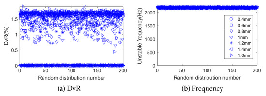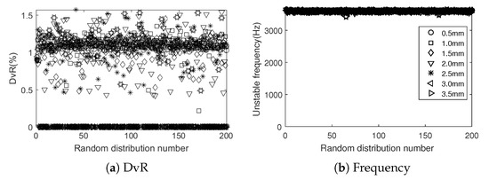 Overall, for the imposed macroscopic contact zone for unstable frequency at 2100 Hz, 1069 distributions of plateaus are found unstable. This sum represents 76.3% of the number of random distributions. The divergence rate and corresponding unstable frequency are shown in Figure 20. These unstable frequencies do not change so much (around 2100 Hz) whereas the divergence rates vary strongly from 0.44 to 1.9%. It can be concluded that distributions of plateaus can suppress instability or modify the intensity of unstable mode at about 2100 Hz. However, they do not change unstable frequency. Similarly, for the imposed macroscopic contact zone for unstable frequency at 3500 Hz, 65.1% of the number of random distributions is found unstable. The divergence rate and corresponding unstable frequency are shown in Figure 21. These unstable frequencies do not change so much (about 3500 Hz) whereas the divergence rates vary strongly from 0.2 to 1.6%. The distributions of plateaus can suppress instability or modify the intensity of unstable mode at about 3500 Hz.