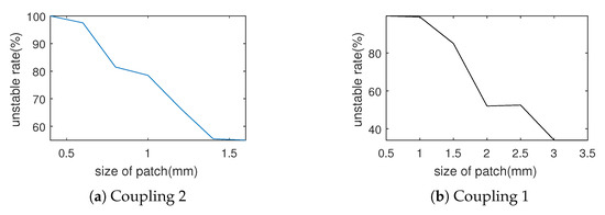 Figure 22 shows the percentage of unstable cases as a function of the patch size. The number of unstable cases decreases as the patch size increases for the 2 couplings. It also appears that this decrease appears for a patch size above a significant value (0.4 mm and 0.5 mm respectively for coupling 1 and 2). Below these values, contact zones appear as macroscopic flat and continuous ones. However, above these sizes, the ratio of unstable sampling decreases significantly, which can be interpreted as a dispersive squeal occurrence, considering that plateaus with size and localization variations differ according to tribological mechanism.
