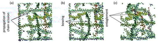 88]. Specifically, shear-driven reactions were found to occur through distortion of the molecules from their equilibrium state, and this distortion occurred when the molecules were covalently anchored to one of the sliding surfaces. The distortion step identified above was also reported in reactive molecular dynamics simulations of alkyne self-assembled monolayers using AIREBO, which showed how crosslinking of chains was initiated by mechanical deformation of the monolayers [