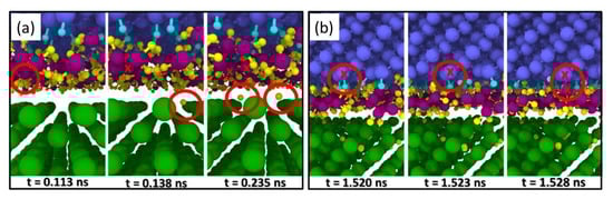 76]. Specifically, it was shown that water can facilitate wear chemically by providing oxygen to form Si–O–Si bonds and terminal H atoms that help bond rupture, but can also hinder wear mechanically by preventing the contact between the surfaces. Subsequent simulations were performed at a range of temperatures and with varying amounts of water and revealed that both factors affected the formation of covalent bonds that bridge the two solid surfaces [