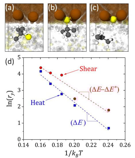 83] The reaction yield was quantified by the rate-limiting step, and the simulations demonstrated that the energy barrier was lowered by shear force acting along the reaction coordinate for the rate limiting step of the reaction. Next, the reaction yield at each temperature was fit to the Bell model [