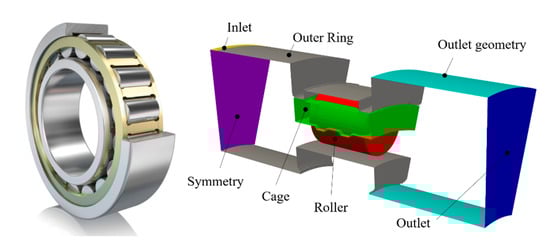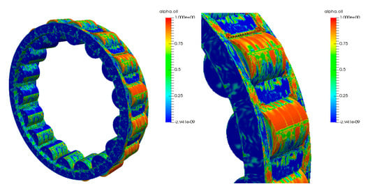 Hu et al. [] studied the oil distribution and the power losses of a bearing by means of commercial software using a rigid mesh motion/mesh sliding strategy. This approach relies on multiple meshing regions with interfaces between the grids. A similar approach was used by Zhang et al. []. Liebrecht et al. [,] used the same modelling technique to study tapered roller bearings.