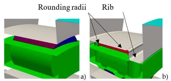 Different configurations: #1 no ribs, no rounding radii, cage M1 (a), #3 ribs, rounding radii, cage M1A (b).