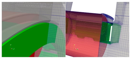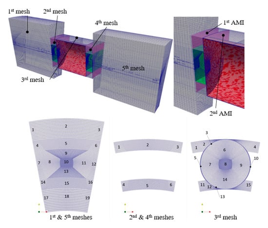 The principle behind this approach was the decomposition of one lateral face into a set of quadrilaterals. Edges can be straight lines, arcs or splines []. The further discretization of the 4-edged polyhedron was defined through the seed of 2 adjacent edges. In Figure 3 (bottom left) it can be appreciated that the grid—created with blockMesh []—was made of 19 quadrilaterals (blocks). The blocks always had 4 edges. Some of them were curved according to a defined function. In block 2 (1st mesh), for example, the upper edge was curved to follow the outer ring curvature. The left edge of block 8 (1st mesh), was curved to follow the curvature of the roller. Other edges (for example of block 10—1st mesh) were curved just to keep the quality of the elements above a certain threshold.