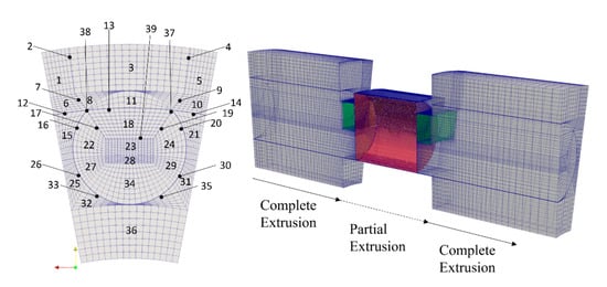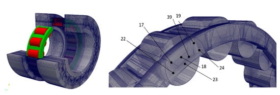 For configuration #2, in which the rounding radii were neglected (but not the ribs), it was possible to create the whole geometry with multiple extrusions without the need of AMIs. To achieve this goal, a more complex partition of the frontal (extrusion) surface (Figure 4 left) was used. This consisted of 39 blocks. Not all the blocks were extruded for the whole bearing length. Block 1 to 5, for example, were missing in the mid (axial) portion where the outer ring was located. In the same way, blocks 11, 13, 18, 22, 23, 24, 27, 28, 29 and 39 were not extruded in correspondence of the roller. This approach was very powerful and enables the creation of a good quality grid in a very short time (10 s). However, with this approach, it was not possible to model all the rounding radii like those of the rings and of the roller.