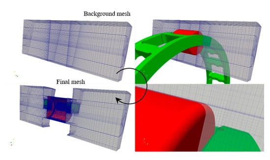 In order to simulate configuration #3, in which all the rounding radii were modelled, a first mesh, without internal cavities (like those corresponding to the roller and the cage for simulation #2) was created analytically with 39 blocks successively extruded. This initial background grid generated (Figure 5 up left) in 11 s. Differently from mesh #2, the 39 quadrangles of the plane surface (Figure 4 right) where extruded for the whole axial length of the model. Successively, in order to create the boundaries corresponding to roller, cage and rings, a cut of the background mesh using a subtractive approach (snappyHexMesh []) was used. In a first stage, the cells of the grid intersecting the surfaces of roller, rings and cage (defined via .stl files), were split into smaller cells (refinement). Each cell was subdivided into 8 smaller cells. Eventually, if required, the resulting refined cells were further split until the desired accuracy is reached. Once this operation is complete, a process of cell removal began (Figure 6). All cells inside the stl-defined boundaries (i.e., inside the solid rollers, the solid cage and the solid rings) were removed from the grid.