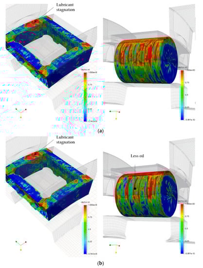 Figure 10 highlights the differences induced by the relative position to the roller with respect to the gravitational acceleration. Small differences in terms of oil distribution were present even if the structure of the bearing was axis-symmetric and the mesh was the same for each sector. As can be expected, the lower the position of the roller, the higher its wetting with lubricant.