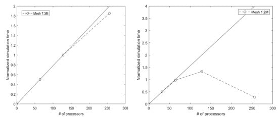 The 7.3 M- and the 1.2 M-cells meshes (configuration #1) were used to assess the scalability of the numerical model on the number of processors. For the finer grid, simulations were performed on the VSC cluster using 64, 128 and 256 cores. Figure 11 (left) shows the good scalability of the results. The same was made for the 1.2 M mesh. While the scalability seemed to be linear up to 64 cores, the time required for the solution did not reduce significantly with 128 cores. With 256 cores, the computational effort even increased. This was due to the time required for the exchange of information between processors that became higher than the solution time itself. The best configuration for this specific case was found to be around 20 k cells per core.