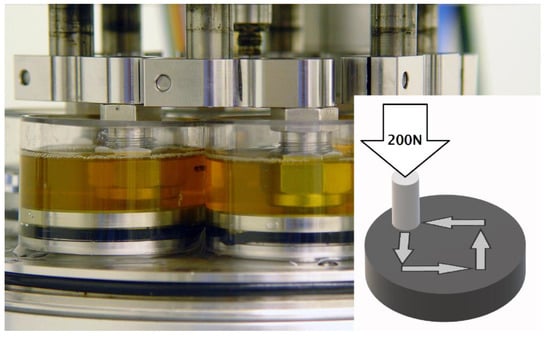 All tests were conducted on a pin-on-disk (POD) wear testing apparatus (OrthoPod, AMTI, Watertown, MA, USA) seen in Figure 1. This apparatus has six stations, each consisting of a CoCrMo disk articulating against a UHMWPE pin. Pin motion was programmed to execute a 15 × 15 mm square cycle to be completed within one second. This led to perpendicularly crossing motion trajectories on the pin and an average sliding velocity of 60 mm/s, which is similar to that occurring in a hip joint. A load of 200 N was applied to the pin, yielding a technical stress of 2.8 MPa on the UHMWPE pin. Again, this is similar to the average contact stresses of artificial joints. Each of the stations was confined by a Plexiglas cylinder containing 15 mL of lubricant, surrounded by a water bath in excess of 1 L, kept at 37 °C.