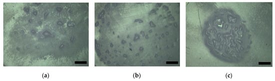 Representative micrographs of the center of pins after 2 MC wear cycles. The pins were run in (a) BSA, (b) Low FA/BSA, and (c) bilirubin/BSA testing solutions. Scale bar is 1 mm.