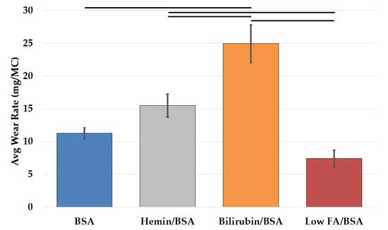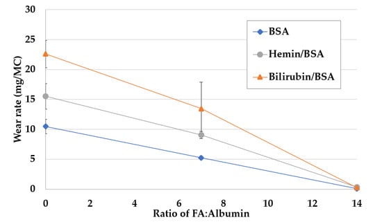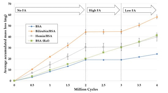 The interaction of FA on wear of bilirubin- and hemin-BSA solutions was also examined by the addition of two concentrations of FA. For Low FA lubricants, 3.17 mM of FA was used; for High FA lubricants, 6.34 mM of FA was used (or a 14:1 ratio of FA to BSA).