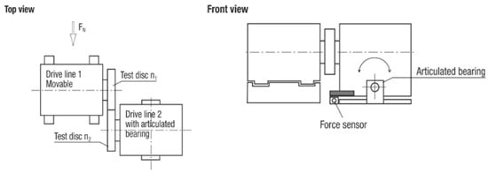 Two-disc test rigs are model tribometers, which drive two rotation symmetrical test specimens and press their cylindrical or spherical surfaces against each other. The most popular two-disc test rig is the Amsler test machine, type A135, which was introduced in 1922 []. The SAE EP test machine (SAE 2 machine) using Timken test cups was introduced in the 1930s. Twin disc tribometers are used to simulate the boundary lubrication of rolling contacts under a preset slip ratio. Lubricating oil is typically introduced to the tribocontact through an injector or from a thermostatically-conditioned reservoir below one of the discs. Compared to “historic” twin disc tribometers, the shaft in the 2disk is independently driven. Operation can either be synchronous or asynchronous, such that each disc can operate at different speeds since each disc is mounted on an independent drive shaft. A schematic of one of these tribometers is shown in Figure 1. The two shafts are water cooled in order to absorb the generated frictional heat.