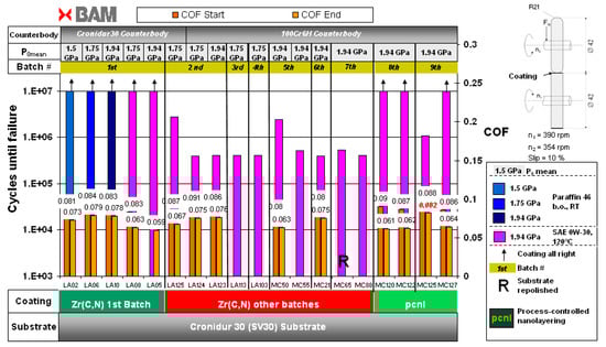 Figure 2 displays the results of the ten batches of coated samples when tested under the aforementioned conditions. The figure includes information for the number of cycles reached before failure according to Hertzian contact pressure, coefficient of friction, and temperature (color of the bars). The samples are also divided based on the batch number, lubricant, and testing configuration used. There are notable differences in the cycles reached between batches, an observation the authors reasoned could be from microstructural differences in the coatings. Even with performing pre- and post-mechanical surface treatments, these variations could not be eliminated and actually worsened the slip-rolling performance of the samples. However, three additional batches, Batches 8–10, were made using process-controlled nanolayering (pcnl) to attempt to replicate the results of the first batch, with much success.