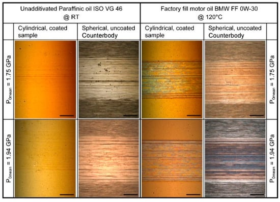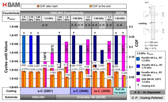 Thin film coatings are viewed as a cost-effective way to reduce friction and prevent the adhesive failures of mechanical components. This is especially important in the automotive industry as emission and energy standards are becoming increasingly tight. Diamond-like coatings (DLC) are the fore-runners in this field, but the friction reduction is sensitive to the additive package and can be further improved by specific additives, like glycerol monooleate (GMO, 111-03-5) and glycerol monoisostearate (66085-00-6). Zr(C,N) inevitably forms ZrO2 on its surface, which interacts with state-of-the-art additives tribologically in the same way as steels. Zr(C,N) coatings underwent fatigue tests for mean contact pressures ranging from ~1.5 to 2 GPa with a fixed slip ratio of 10%. Tests were carried out for two temperature regimes: room temperature and 120 °C. For the tests at room temperature, an unadditivated paraffinic oil in ISO VG46 (ν40°C = 51.96 mm2/s) was used, and for the tests at 120 °C, fully formulated motor oil (BMW SAE 0W-30) was used. The higher oil temperature intensifies the tribological stresses of the system, as oil film thickness decreases exponentially with temperature. For the fully formulated engine oil SAE FF 0W-30 (“VP1”; HTHS = 3.0 mPas, ACEA A3/B4; ν120°C = 5.33 mPas), the calculated value of the minimal film thickness hmin is 0.0252 µm at T = 120 °C and FN = 2000 N. The roughness values of the steel substrate (Ra cyl. = 0.0048 µm, Ra sph. = 0.17 µm) result in a parameter of Tallian of ~0.144, which denotes the regime of boundary lubrication. The same tests were also done using uncoated test discs and several ta-C and a-C coatings [].