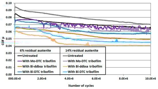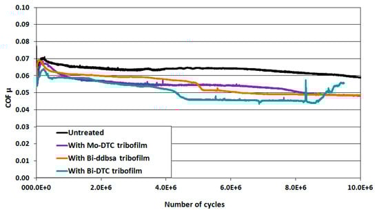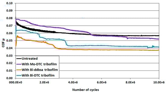 The frictional response of new additives, like bismuth dimethyldithiocarbamate (Bi-dtc) and bismuth dodecylbenzenesulfonate (Bi-ddbsa), in comparison to molybdenum dithiodialkylcarbamate (Mo-DTC, C11-14-branched and linear alkyl) [] will be presented in this section. In the same test, the wear properties are also gathered and, if the test is executed to ten million load cycles, are also indicative of the slip-rolling resistance. Burbank and Woydt [] determined if bismuth compounds can be used as a lubricating additive as an alternative to molybdenum-based additives, since some negative eco-toxicological properties of the molybdenum compounds are of increasing concern. Bismuth additives may participate in similar reactions to form tribofilms and could potentially offer improved tribological performance with a reduction in frictional losses.