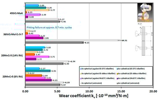 Furthermore, the wear coefficient (kV) was determined after the endurance testing for each steel contact and tribofilm. The wear coefficient results are shown in Figure 8.