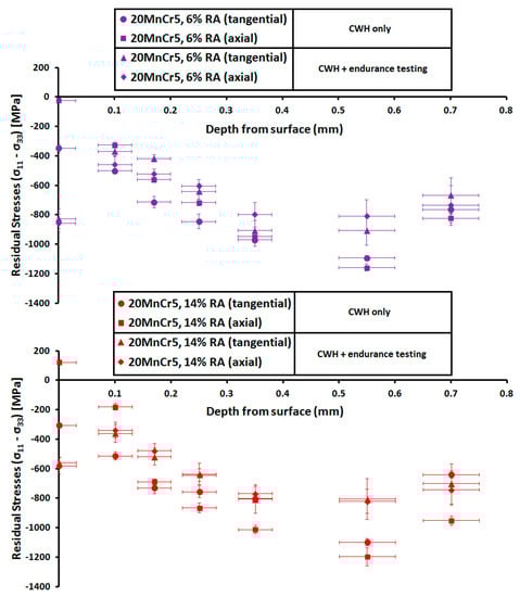 Residual stress depth profiles of 20MnCr5 after cold work hardening (CWH) and, additionally, CWH+slip-rolling endurance testing at P0mean = 1.5 GPa [].