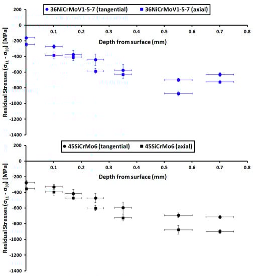 Residual stress depth profiles for 36NiCrMoV1-5-7 and 45SiCrMo6 after CWH [].