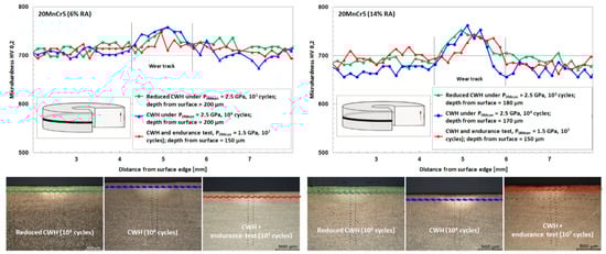 Microhardness profiles across sample surface of case-hardened 20MnCr5 after CWH, and after CWH+slip-rolling endurance testing [].