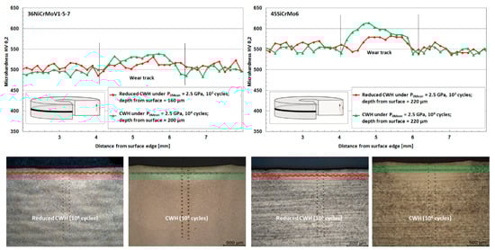 Microhardness profiles across sample surfaces of non-case-hardened high-performance steels, 36NiCrMoV1-5-7 and 45SiCrMo6, after CWH [].