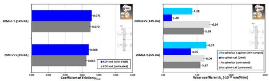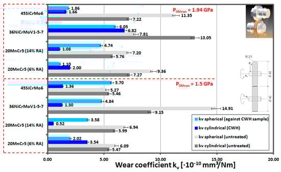 Wear rates of the spherical and cylindrical discs at the end of slip-rolling testing at 120 °C, cold work hardened under optimized CWH conditions [].