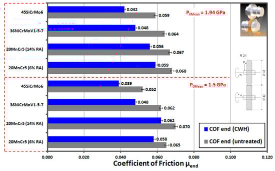Coefficients of friction at the end of slip-rolling testing at 120 °C of samples, cold work hardened under optimized conditions [].