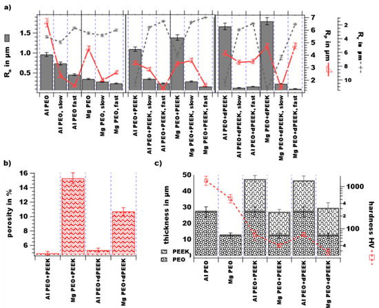 The coating thicknesses achieved, depicted in Figure 1c, are measured in the metallographic cross section. Here, the Mg PEO coating is comparably thin. The hardness, which was measured with a force of 200 mN in the case of the PEO coatings, decreases from 1389 HV for Al PEO to 518 HV for the Mg PEO coating, which is due to the lower hardness of the MgO-phases in comparison to the Al2O3 phases.