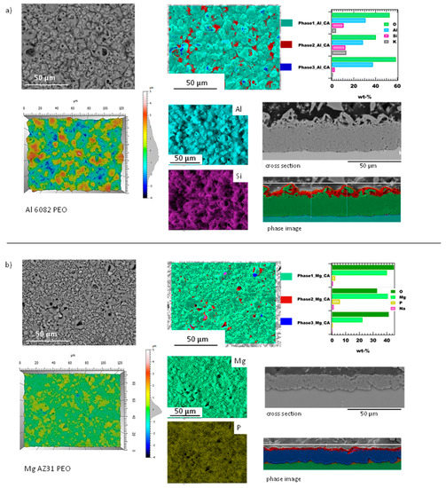The elemental contribution on the Mg PEO surface appears more homogeneous, ceramic MgO results in a softer surface with a superfine microstructure, whereas the electrolyte components are distributed homogenously and in lower amounts. The outer layer, depicted in red in the cross-sectional phase diagram, contains only 3.2 wt% of Si and 2.4 wt% of P.