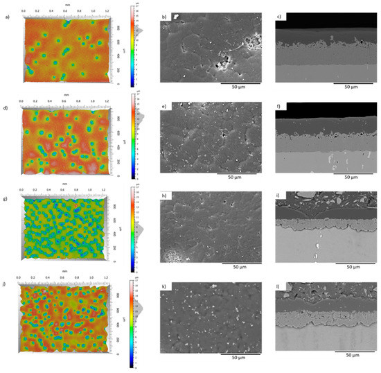 Figure 3. Morphology of the hybrid coatings: (ac) Al PEO + PEEK; (df) Al PEO + dPEEK; (gi) Mg PEO + PEEK; (jl) Mg PEO + dPEEK; left: 3D overview of the surfaces; middle: SEM zoomed in on the surfaces; right: cross-sectional view.