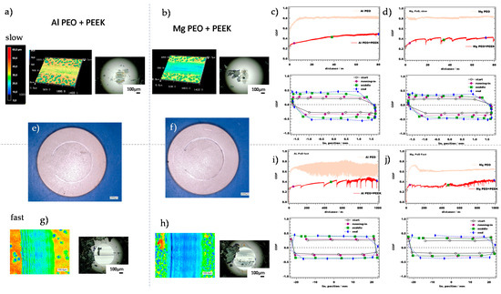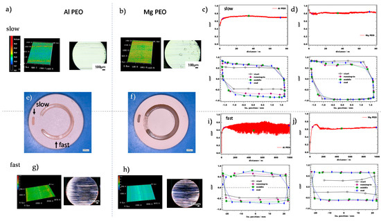 Figure 8. Wear and friction results of the hybrid PEO + PEEK surfaces: (a,b) the wear trace and the corresponding ball surfaces of Al and Mg PEO + PEEK surfaces after the slow testing regime, respectively; (c,d) the corresponding coefficient of friction of the slow regime in the upper part. The lower part shows selected positions within that curve; (e,f) the macroscopic view of the sliding traces on the samples; (g,h) the wear trace and the corresponding ball surfaces of Al and Mg PEO + PEEK surfaces after the fast testing regime, respectively; (i,j) the corresponding coefficient of friction of the slow regime in the upper part. The lower part shows selected positions within that curve.