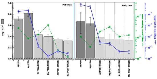 Thus, the PEEK top layers have thicknesses of 12–20 µm, they do not show a worn-through exempt Mg PEO + PEEK under the fast testing regime, as was reported for PEEK coatings on steel by Hou et al. [44], while the COF is comparable for the reported pure PEEK coating against steel [39,40,44,46,52]. The influence of the sliding speed and load on the coefficient of friction reported by Laux et al. [53] could not be found for the coatings, studied here, since the average friction is mostly stable under both testing regimes for the two substrate materials.