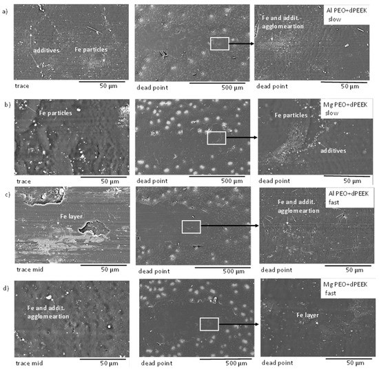 The tribological results of the PEO + PEEK hybrid coatings on both alloys after the two sliding test conditions are shown in Figure 8. Looking at the friction results, it becomes obvious, that in all cases the hybrid surfaces lead to a decrease in the friction in comparison to the naked PEO surface. Therefore, the PEEK top coating acts as a solid lubricant in this system. Especially, in the case of the slow sliding regime on the Al PEO + PEEK surface, the sliding curve exhibits smooth and stable behavior after a certain running-in distance. In the case of Mg PEO + PEEK there are some break-ins in the COF curve, indicating a slip-stick behavior in this tribological system under those testing parameters. This might be due to the higher number of pores in the Mg PEO + PEEK, as well as the deeper valleys in this coating (see Figure 1). Furthermore, the lower hardness of the PEEK top layer on the Mg alloy may lead to a higher adhesive wear behavior. In both cases (Al and Mg PEO + PEEK coatings) the dead points (Figure 9a,b) are governed by grooves, which are due to microcutting effects in the regions of highest wear. Additionally, adhered material can be found. At the middle of the trace, where the velocity t is on its highest, the grooves are less dominant. Here, viscous flow and material transfer might be the dominating wear mechanisms, as reported by Zhang and Schlarb for PEEK surfaces for a pressure of 4 MPa [50]. The trace of Al PEO + PEEK under the slow sliding regime exhibits a thin layer of Fe, as marked in Figure 9a. Furthermore, the amount of iron measured by EDS at the dead points is much higher than that for the Mg PEO + PEEK surface, which is in agreement with the determined lower wear coefficient for the ball (see values in Figure 4a). The middle of the trace of Mg PEO + PEEK does not exhibit any iron content but pulled-out PEEK fragments and ripple-like structures perpendicular to the sliding direction, which are also witnesses of the slip-stick effect [51].