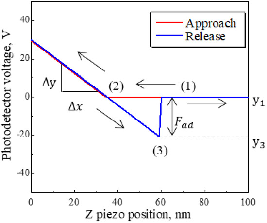 The difference between the values of Y at (1) and (3) in Figure 1 was converted to the adhesion force Fad by multiplying the PD sensitivity S and cantilever spring constant k.