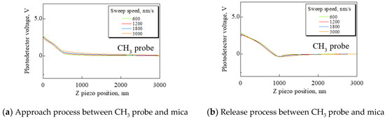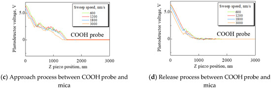 Mica was used as a substrate. Force curves were obtained under the following conditions: Sweep distance L = 3000 nm; sweep start position Ls = 2500 nm; and sweep speed v = 600, 1200, 1800, and 3000 nm/s. The force curves measured by the CH3 and COOH probes are shown in Figure 2. In Figure 2, (a) and (c) show the approach process, and (b) and (d) show the release process. These force curves have significant differences. When the CH3 probe was used, fluid resistance to the cantilever gradually increased according to increasing sweep speed. It was found that the cantilever encountered resistance in the fluid before detecting a repulsive force from the substrate. It is necessary to set the sweep speed as low as possible to measure the adhesion force exactly because the force curve is corrected by using the area of force non-detection. However, when the COOH probe was used, the probe detected a small attractive force and repulsive force in both the approach and release process.