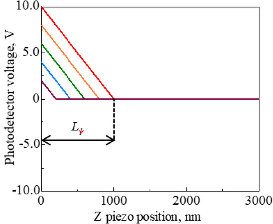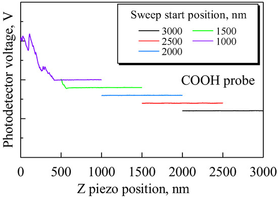 Then, to examine the cause of these small forces, sweep distance L and sweep start position Ls were set as L < Ls, and we investigated the distance over which small forces are exerted on the probe. Force curves were obtained under the following conditions: Sweep distance L = 1000 nm; sweep start positions Ls = 1000, 1500, 2000, 2500, and 3000 nm; and sweep speed v = 300 nm/s. The approach process with the COOH probe is shown in Figure 3. It was found that the probe began to detect the small forces at a distance of approximately 500 nm as the sweep starting position decreased.