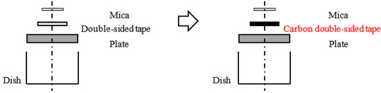 Effect of changing method of fixing from double-sided tape to carbon tape. Mica and oil are insulators. To ground mica with the tape, a carbon double-sided tape was substituted for a general double-sided tape to hold the mica. The resistance of the general tape and carbon tape shows that the general tape is an insulator and the carbon tape is a conductor.