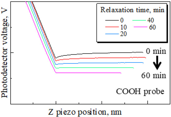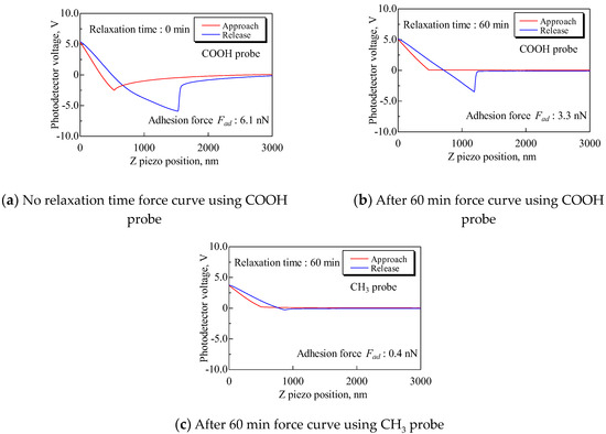 The method of attaching and securing the substrate was changed from a general double-sided tape to a carbon double-sided tape to examine the effect of the electrostatic force. The attachment method using general tape and a carbon tape is shown in Figure 4. The measured resistance of these tapes showed that, while the general tape is an insulator, the carbon tape is a conductor. Therefore, the carbon tape was expected to ground the electrostatic force. If the small attractive and repulsive forces result from electrostatic force, it is assumed that the small forces will decrease as time goes on due to charge relaxation. Then, force curves were obtained under the following conditions: Sweep distance L = 3000 nm, sweep start position Ls = 2500 nm, sweep speed v = 600 nm/s, and relaxation time of 0–60 min. The approach processes of these force curves are shown in Figure 5. It was found that the probe detects a long-range attractive force, although the probe does not detect the small forces without relaxation. In addition, the long-range attractive force gradually decreased over time, and the long-range attractive force disappeared after 60 min. Then, to compare the adhesion forces, the force curves without relaxation and after 60 min are shown in Figure 6. Figure 6a shows the force curve without relaxation with the COOH probe. Figure 6b shows the force curve after 60 min with the COOH probe. Figure 6c shows the force curve after 60 min with the CH3 probe. Every plot also displays the adhesion force.