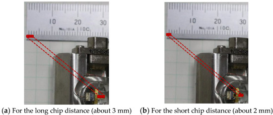 We conducted a test to investigate the effect of dispersion on force curves by installing and removing a chip. Mica was used as a substrate. Force curves were obtained under the following conditions: Sweep distance L = 3000 nm, sweep speed v = 600 nm/s, and cantilever load on the substrate P = 4 nN (by adjusting sweep start position Ls). The two states of setting the chip with long and short protrusions from the holder are shown in Figure 7. We investigated the effect of the two chip states on PD sensitivity S by obtaining 10 force curves and comparing the two chip states. PD sensitivities in each state are shown in Table 3. Each mean value had a difference of about 1.6 times. There are two test condition differences between the long-chip state and short-chip state as follows: (1) Protrusion length of the chip from the holder and (2) laser position on the cantilever.