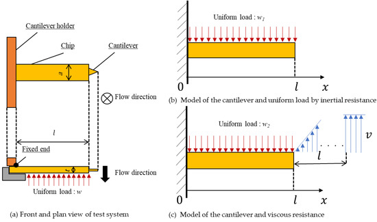 First, to explain difference (1), models of cantilever loaded uniform load by inertial resistance and viscous resistance are shown in Figure 8. The cantilever deflection δ at point x = l is given by