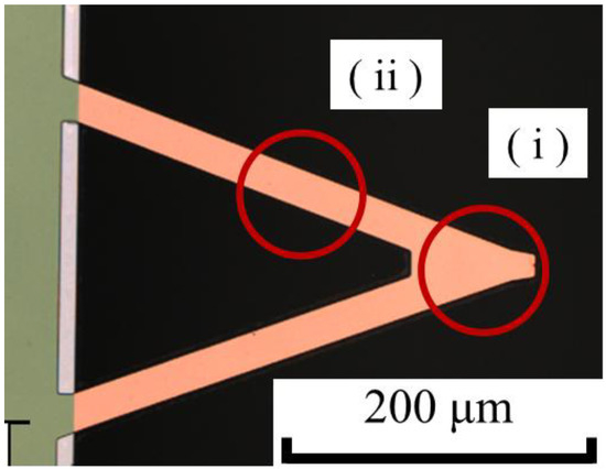 Second, to explain difference (2), the laser position, the relationship between the cantilever and laser position is shown in Figure 9. This test was conducted to confirm the effect on PD sensitivity of installing and removing the cantilever by changing the two chip states between long and short protrusion. However, this test includes the deviation of the laser position on the cantilever in addition to the chip states. Although the operator tried to irradiate position (i) shown in Figure 9, the laser position could not be visually checked, due to the structure of the AFM apparatus, and the position was inferred from the laser intensity and the state of intensity. For instance, there is a possibility of irradiating location (ii) shown in Figure 9. It is suggested that the deviation in the laser position greatly affects PD sensitivity. For both reasons, it was clear that the effect of deviation on the force curve by installing and removing the chip is significant.