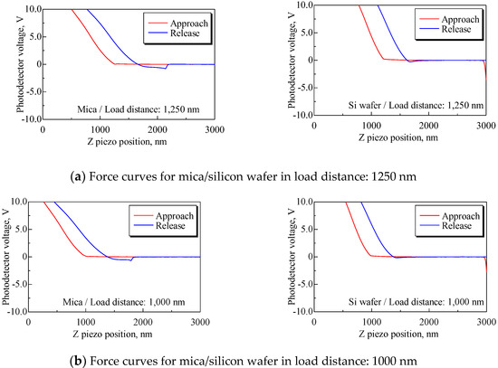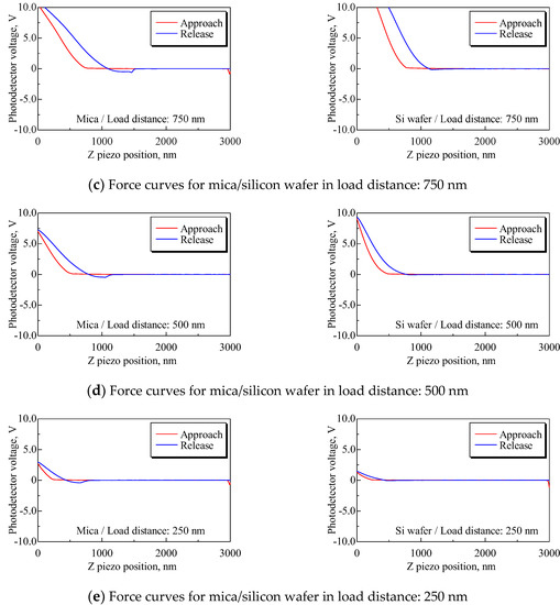 Force curves for mica and silicon wafers for each load distance. Both slopes of the approach process, especially at load distances Ll = 1250, 1000, and 750 nm, have differences, and the mean PD sensitivities for mica and silicon have an approximately twofold difference, as shown in Table 4.