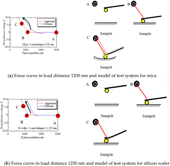 At load distances Ll = 1250, 1000, and 750 nm, the mean PD sensitivity for mica and silicon had about a twofold difference. The models of the system are shown in Figure 12 to explain this mechanism. Figure 12a shows the force curve for mica at a load distance of 1250 nm and the model of the AFM measurement system, and Figure 12b shows that for the silicon wafer at the same load distance. First, (a) represents the model for mica, which assumes that the cantilever deforms while the mica deforms and contacts the substrate, as shown in sketch (a). In this case, the cantilever deformation changes the photodetector voltage in a positive direction and the deformation of mica changes the voltage in a negative direction. As a result, it is suggested that the two phenomena balance and make the slope small, that is, the PD sensitivity is large. By contrast, Figure 12b is a model for a silicon wafer that assumes that the cantilever only deforms because Young’s modulus of silicon is larger than that of mica, as shown in Table 5. Therefore, it appears that PD sensitivity depends only on cantilever deformation, which means that the PD sensitivity for silicon is more accurate than that for mica. Meanwhile, at load distances Ll = 500 and 250 nm, both PD sensitivity values increase. The selectable range of detecting force area is limited according to the shortened load distance. Thus, the data that include adhesion energy are used to convert PD sensitivity, and that is the cause of increased PD sensitivity [21].