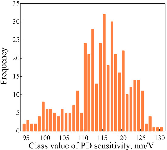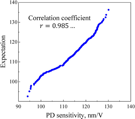 Normal Q–Q plot for PD sensitivity from 400 tests. As the correlation coefficient of sample data processed with normal Q–Q plots approaches 1, it is suggested that the distribution of the samples is Gaussian. Therefore, the distribution of PD sensitivity is considered to be a Gaussian distribution.