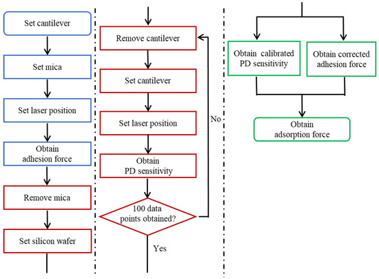 The above analysis allows us to propose a more accurate adsorption force measurement method. A flow chart of the method is shown in Figure 15. It should be noted that PD sensitivity ought to be calibrated after force curves are obtained for the substrate and polar group for which the adsorption force is to be measured. This sequence is intended to prevent the PD sensitivity calibration procedure from affecting the accuracy of the adsorption force measurement.