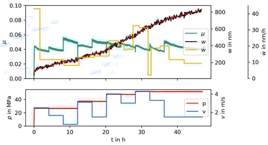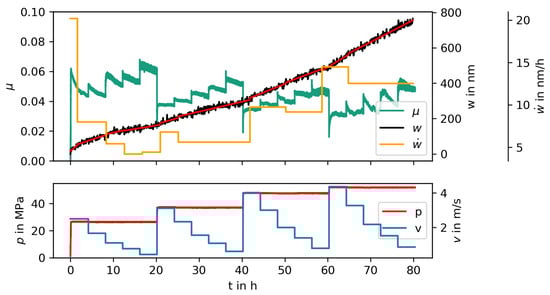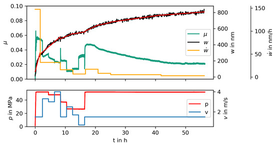 The identification of key levels is successfully accomplished; for friction, wear, stability, and sensitivity, real-time data are available for evaluation. However, in most cases, continuously recorded wear data are not at hand. The evaluation of friction data alone is not constructive, since friction and wear seldom run in a proportional way. Both entities usually possess different time constants, as demonstrated in Figure 3. At about 42 h, the wear rate stays constant, while friction is still decreasing. In addition, there are tribological states where friction is low but wear is exceedingly high, as shown in [14] for the case of a lubricated metal–metal system with presence of soot in the oil. As a consequence, tribological optimization by running-in control has to be accompanied by in-depth analysis of wear.