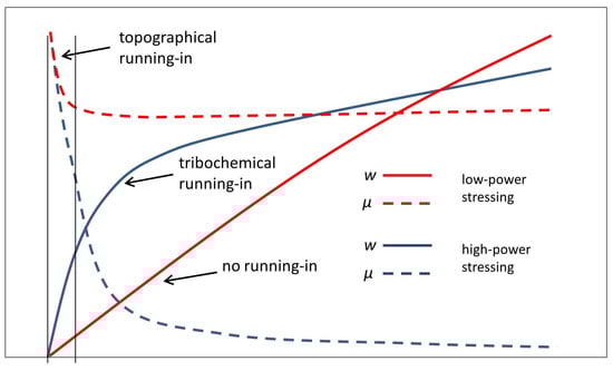 As mentioned above, the running-in can generally be subdivided into a topographic and a tribo-chemical phase, Figure 4. Whereas the topographic phase is usually a matter of minutes, the tribo-chemical phase can last hours, days, or even longer, depending on the initial friction power density the system is subjected to. During the topographic phase, wear rates comparable to systems showing abrasive or adhesive wear—i.e., in m/h range—can occur. When those high wear rates prevail, the system will fail due to seizure.