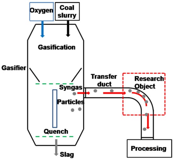Figure 1 shows a schematic diagram about the vulnerable elbow in the coal chemical plant. First, the coal-water slurry is reacted with oxygen to form the mixture gas of syngas (60%) and CO2 (40%) at the temperature of 1350 °C. Second, the mixture gas is cooled and the temperate decreases to 250 °C in the quench chamber. Finally, the mixture gas is departed from the quench chamber and introduced into the transmission pipeline at high speed flow with solid contaminants (sulfur-containing fly ash) eroding the wall. CO2 is dissolved in water forming the saturated carbonic acid solution that results in the electrochemical corrosion of the pipeline under the operational service or out of service conditions. The erosion-corrosion phenomena around the elbow may lead to the serious leakage under the harsh working environments.